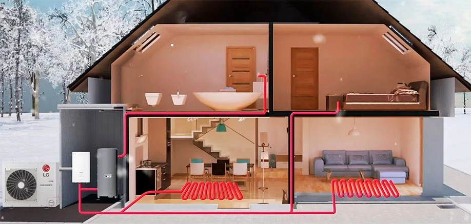 Este sistema extrae hasta un 75% de la energía del aire exterior (incluso en invierno) y la utiliza para calentar, enfriar y producir agua caliente sanitaria. Con solo un pequeño aporte eléctrico, genera una gran cantidad de calor.